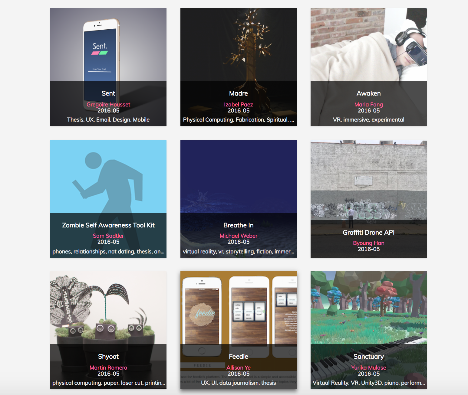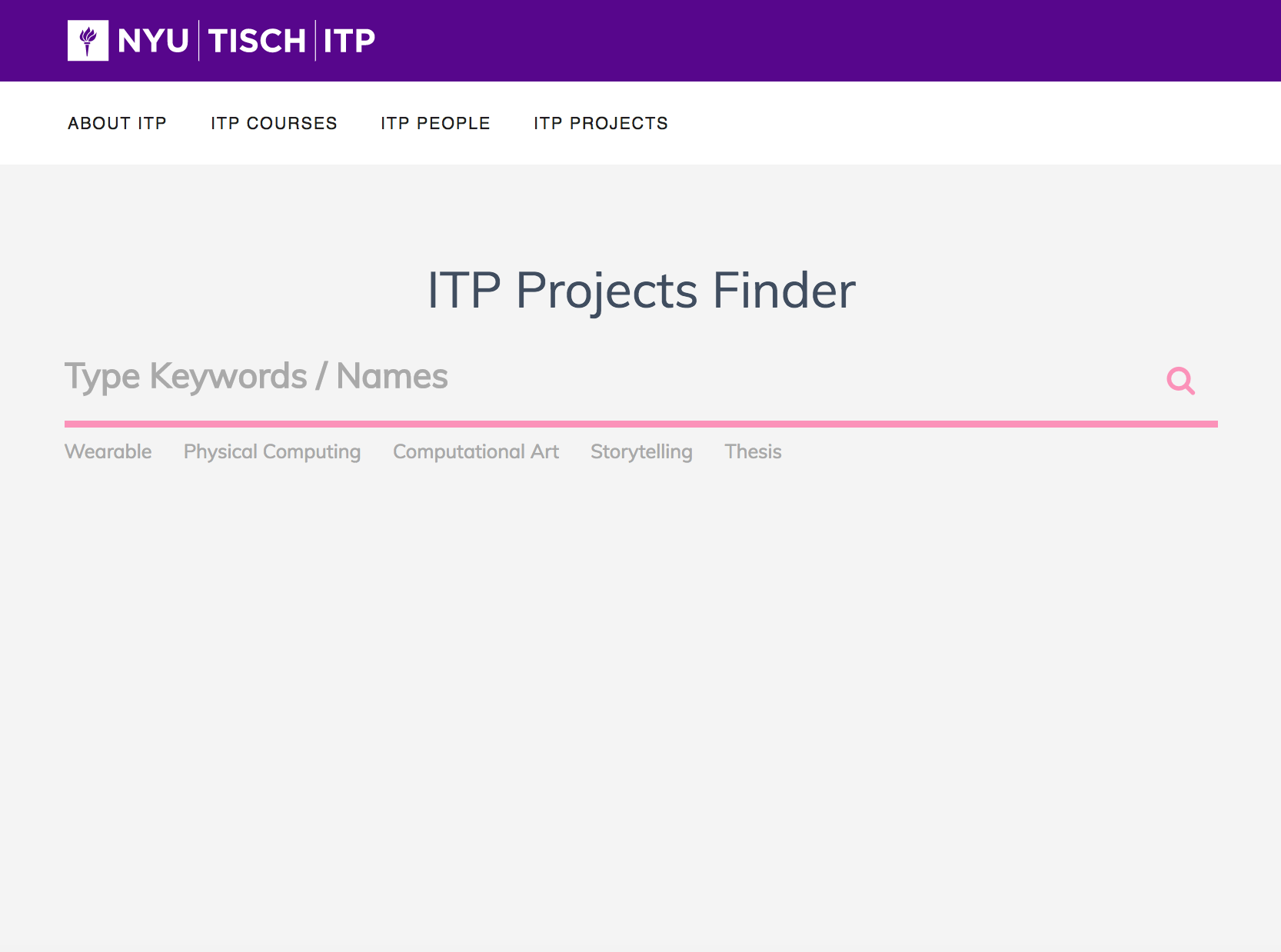 ITP Projects Finder is a web search engine where you can search all ITP projects since 2004 by keywords, author names, even class names. I hope this tool could help people to know more about all the inspiring and awesome ITP projects we created over the 12 years.